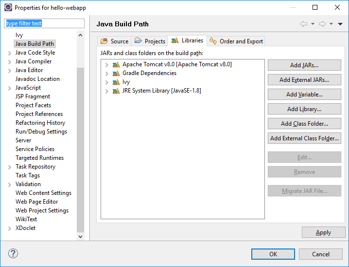 apply plugin: 'java' apply plugin: 'war' apply plugin: 'eclipse-wtp' sourceCompatibility = 1.8 targetCompatibility = 1.8 repositories { mavenLocal() mavenCentral() } war { baseName = 'hello-webapp' version = '0.0.1-SNAPSHOT' } dependencies { compile 'org.springframework:spring-core:4.1.6.RELEASE' compile 'org.springframework:spring-aop:4.1.6.RELEASE' compile 'org.springframework:spring-beans:4.1.6.RELEASE' compile 'org.springframework:spring-context:4.1.6.RELEASE' compile 'org.springframework:spring-expression:4.1.6.RELEASE' compile 'org.springframework:spring-web:4.1.6.RELEASE' compile 'org.springframework:spring-webmvc:4.1.6.RELEASE' compile 'javax.servlet:javax.servlet-api:3.1.0' compile 'commons-logging:commons-logging:1.2' }