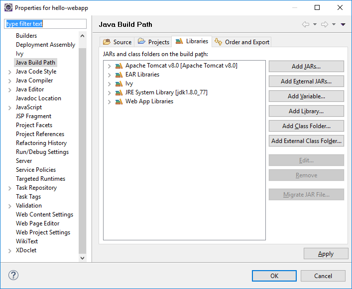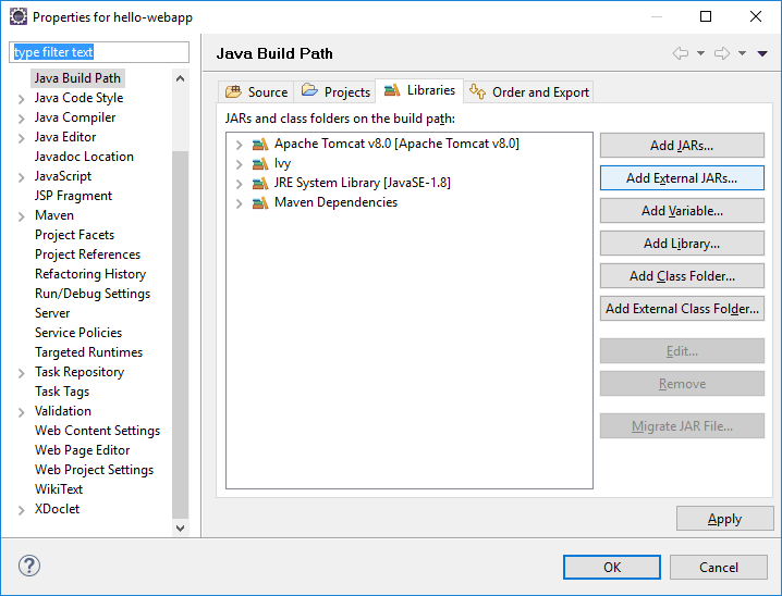 All samples given below are designed to be implemented in Eclipse Mars IDE with embedded Tomcat Server. If you want to set up a similar project by yourself, make sure that your environment allows you to make a web application project to be run on Tomcat Server.