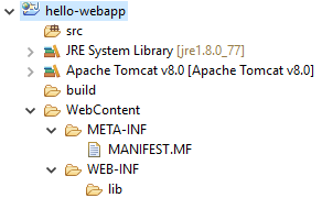 Eclipse should create a similar directory tree including referenced libraries such as JRE and Apache Tomcat libraries: