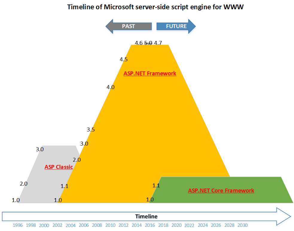 Between 1996 and 2000, three versions of ASP were released. ASP was the first version of the server-side script engine from Microsoft for dynamically generated webpages. The last version of ASP (3.0) was released in 2000. ASP support was still included in the modern Windows NT 2016 operating system. Support for the old ASP will be discontinued in 2020.