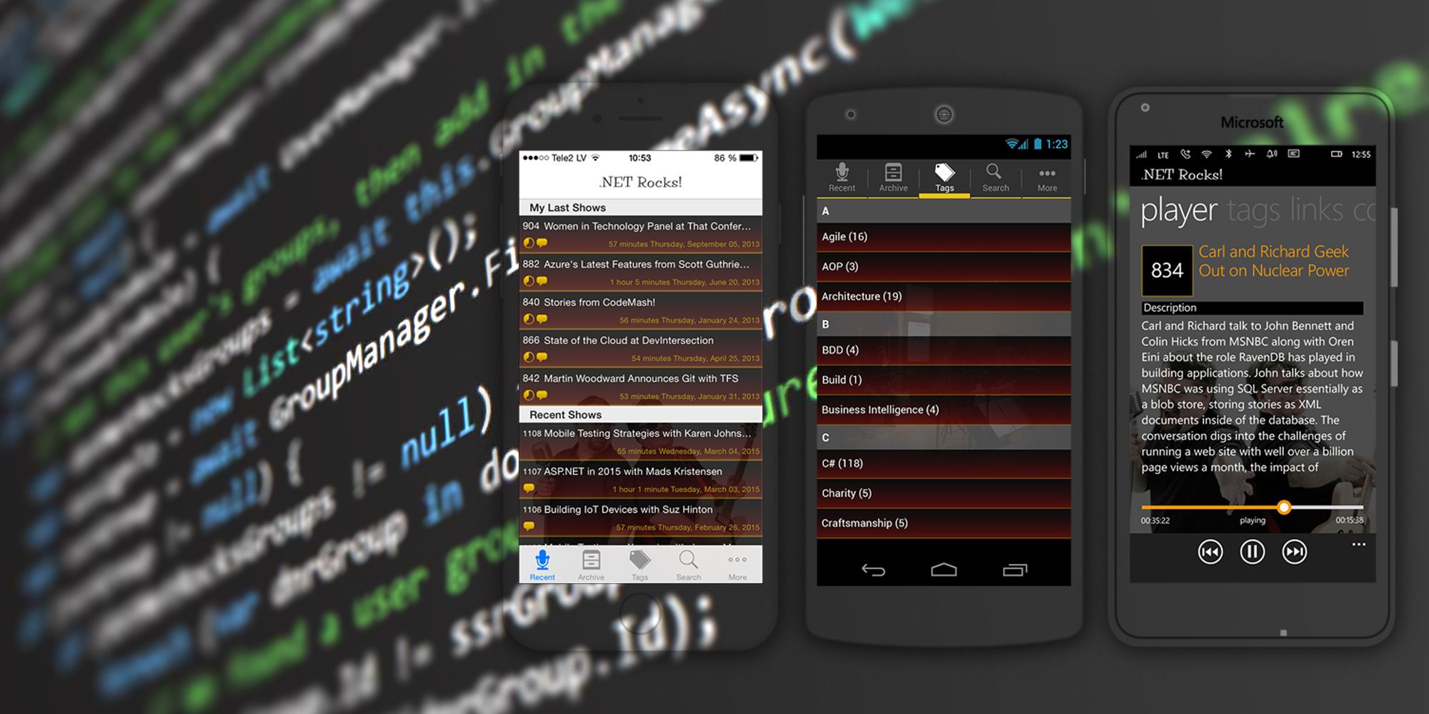 Diatom Enterprises created a .NET Rocks mobile app for iOS, Android and Windows Phone platforms. It is a podcast streaming application targeted at IT professionals.